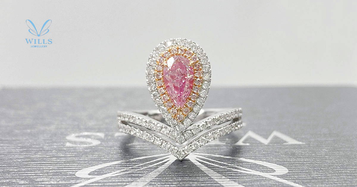 以梨形粉鑽為主石的一款經典后冠戒指,玫瑰金鑲的粉鑽讓粉鑽更為顯大、與鑲滿白鑽的白金外圍形成對比,粉色更為鮮明亮眼,配合優美如羽翼的雙排V形設計,將梨形粉鑽的修長線條完美呈現,讓鑽石光芒優雅地綻放,戴在手上流露高貴氣質,是愈看愈有韻味的經典款式。