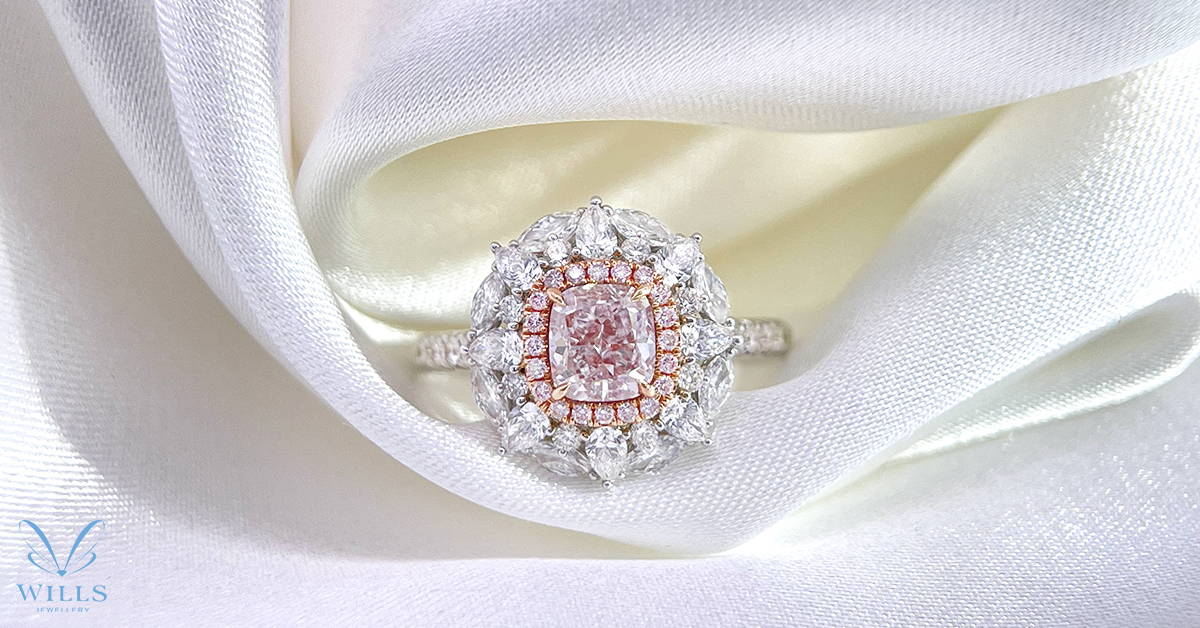 這隻戒指主石是一顆1.02ct的枕形粉鑽鑽石戒指。而正正戒指主石呈淡淡的水紅色色調,令人想到如林黛玉般溫柔清雅的氣質。加上馬眼形切割完美呈現粉鑽透亮淡粉的火彩光芒。