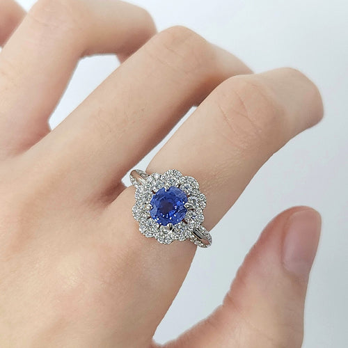 這隻橢圓形藍寶石花形戒指絕對令人讚嘆。主石是一顆重達2.296ct的藍寶石,這顆藍寶石展現出矢車菊藍的色調,並且具有極佳的光澤和清澈度。主石的色彩鮮豔明亮,讓人眼前一亮。