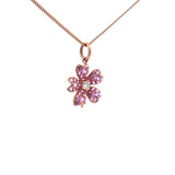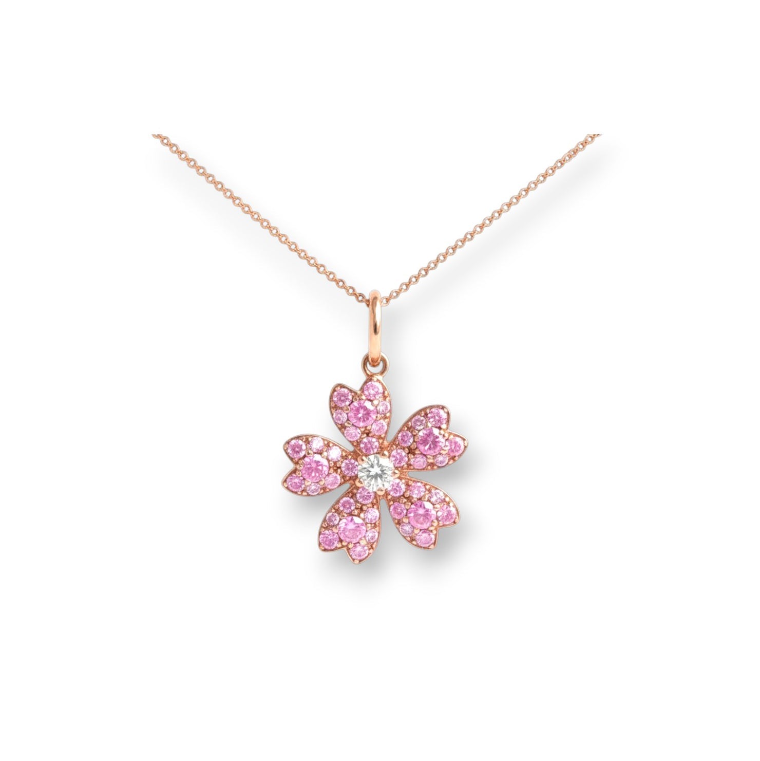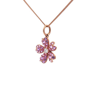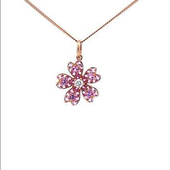 以粉紅色藍寶石組成精緻的櫻花造型。正中間以閃爍的小白鑽作點綴,高低層次分明,優雅秀麗的款式,適合日常及宴會場合配戴。
