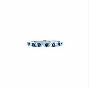 此款戒指以藍寶石和鑽石相間排列,以密釘鑲方式嵌入 18k 白金戒環,典雅而細緻。