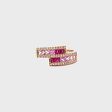 戒指分別以2顆紅寶石及8顆閃亮的粉紅寶石鑲嵌而成,加上深紅至粉紅漸變色排列,色彩甜美,令人容易感到歡樂,全隻戒指採用了雙行設計,可以修飾好手指線條,整隻戒指散發美浪漫夢幻而復古的氣息,能為你加添古典高貴氣質。為您注入青春活力,並添上一份柔和高貴氣質。典雅而精緻的款式,適合任何場合佩戴。