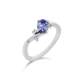 戒指以珍貴的坦桑石作為主石,散發著藍中帶紫的獨特色澤,配上圓形白鑽點綴,不規則的造型,顯得時尚新潮,非常適合日常佩戴。