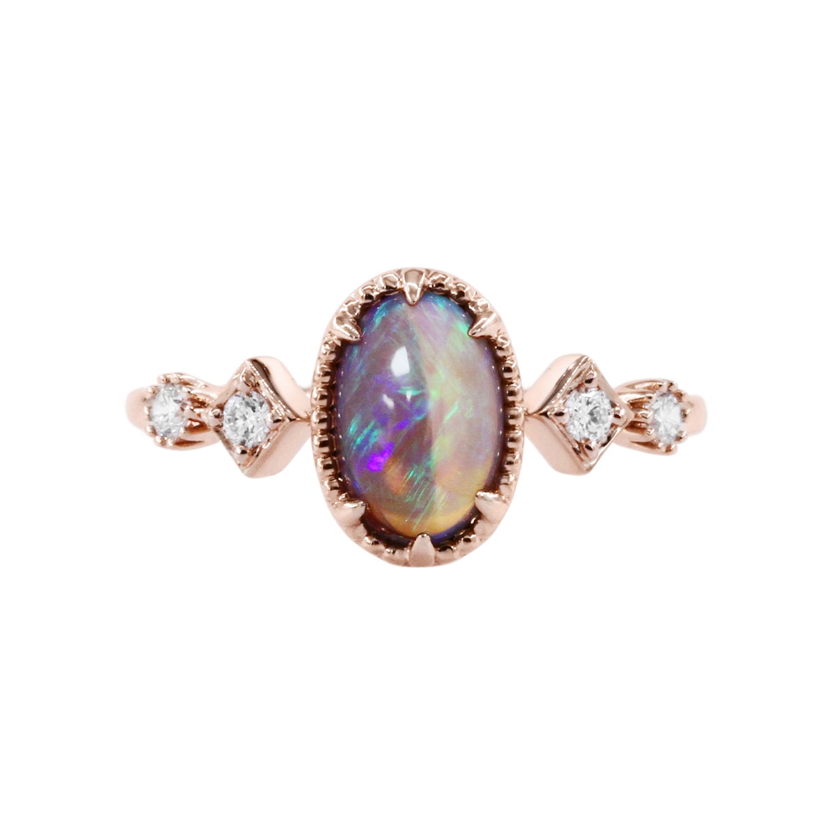 WILLS採用優質天然水晶蛋白石作為戒指的主石,罕見的陰陽色彩,並呈現出七彩繽紛、變幻莫測的彩色折射;外圍配以珠邊圈繞,突出主石的光芒。精緻秀麗的款式,不論是日常外出還是出席宴會佩戴點綴都十分合適。