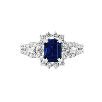 天然藍寶石帶著皇家藍色澤,外圍配以一圈鑽石圍石;戒指臂配上梯方鑲鑽設計,使整枚戒指散發著脫俗、優雅的氛圍。