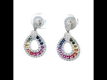 耳環以彩虹色寶石鑲嵌而成,色彩繽紛,高貴優雅,兩行內外鑽石圍石設計,而且分立體感十足典雅而精緻的款式,適合任何場合佩戴。