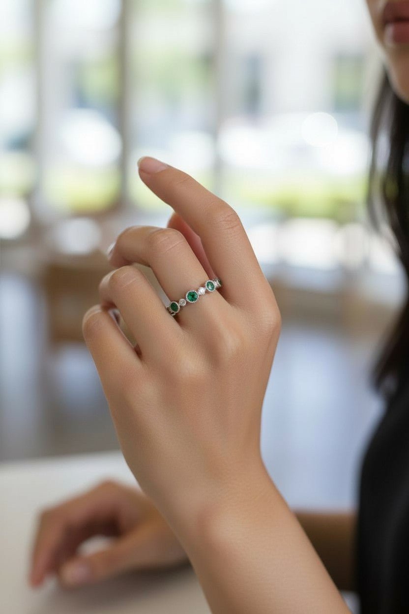 經典排列設計,白金戒環精緻優雅,祖母綠與鑽石交替排列閃耀低調奢華,百搭各種穿搭展現品味。