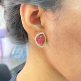 The 18K rose gold earrings feature a triangular tourmaline as the main stone, showcasing a vibrant red and green color reminiscent of a watermelon.It gives a refreshing and sweet feeling, with a circle of dazzling diamonds set around the outer edge of the tourmaline, allowing you to exude a sweet and noble temperament.Suitable for daily wear or banquets. Create a unique exquisite jewelry style just for you.
