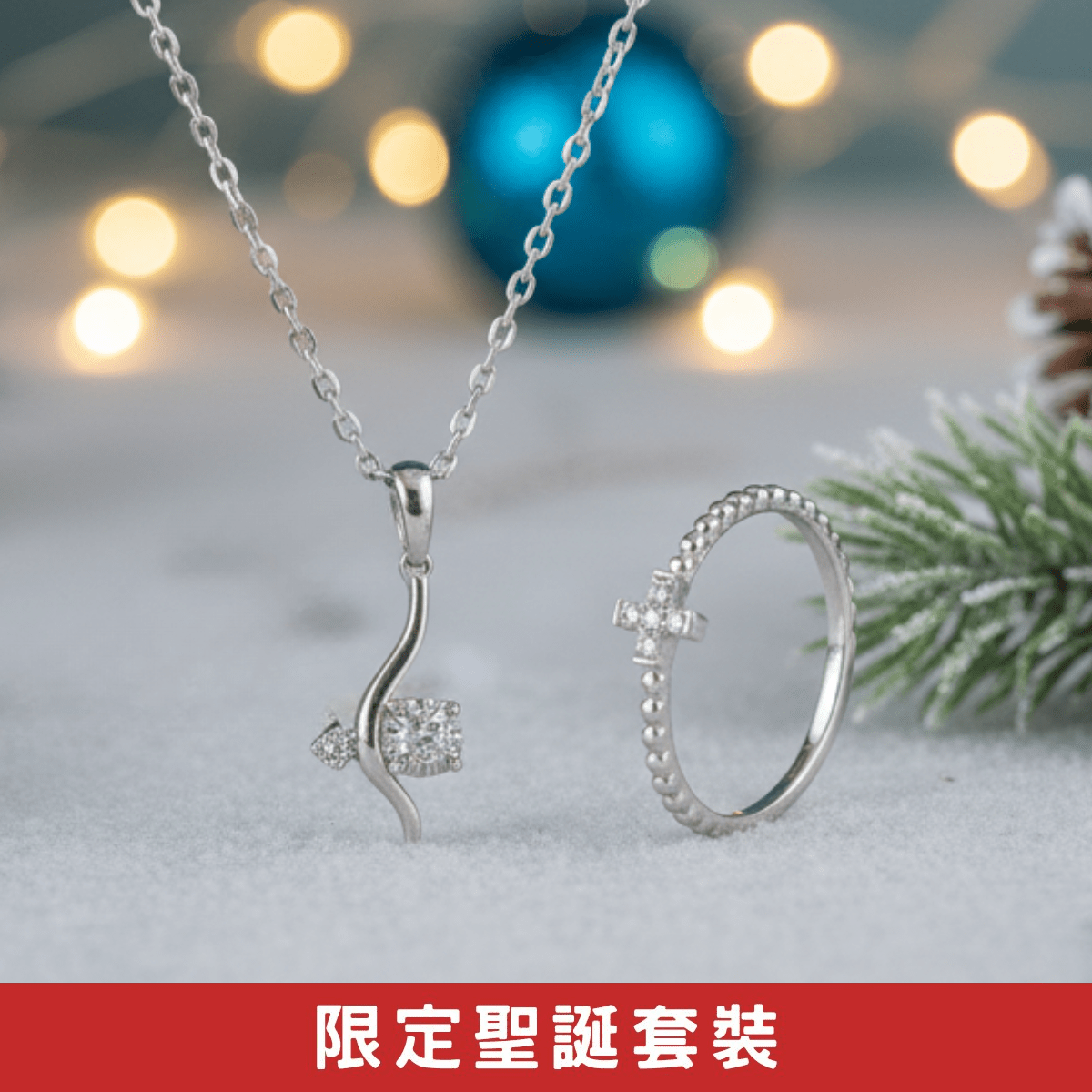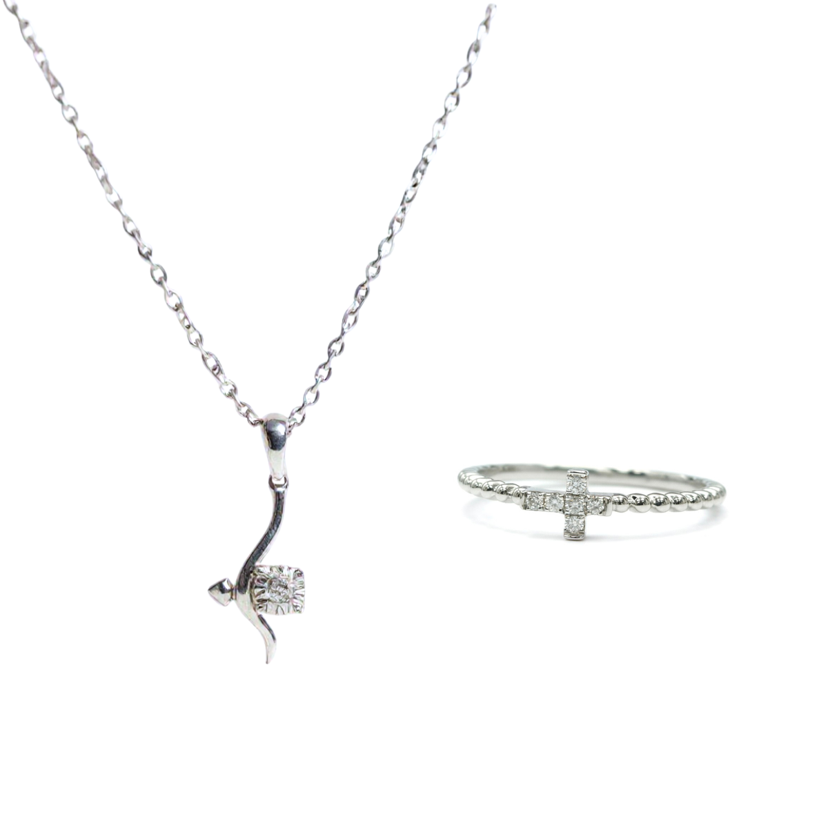(聖誕套裝) 白金花卉鑽石吊墜 +白金簡約十字鑽石戒指