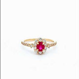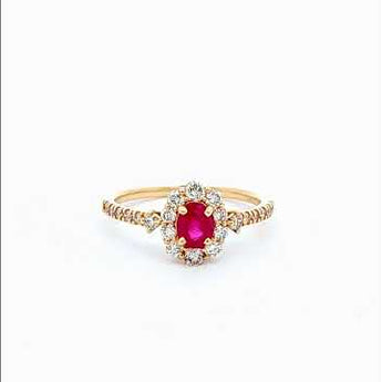 The oval-shaped ruby is surrounded by a sparkling halo of bezel-set diamonds, creating a magnificent vintage style. Its form resembles a blooming flower, embodying classic and timeless fashion, allowing you to maintain an elegant and noble demeanor whether at work or at a banquet.