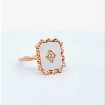 The main stone of the ring is made of mother-of-pearl, exuding an elegant luster, complemented by a diamond shape formed by four diamonds in the center, creating a noble appearance.