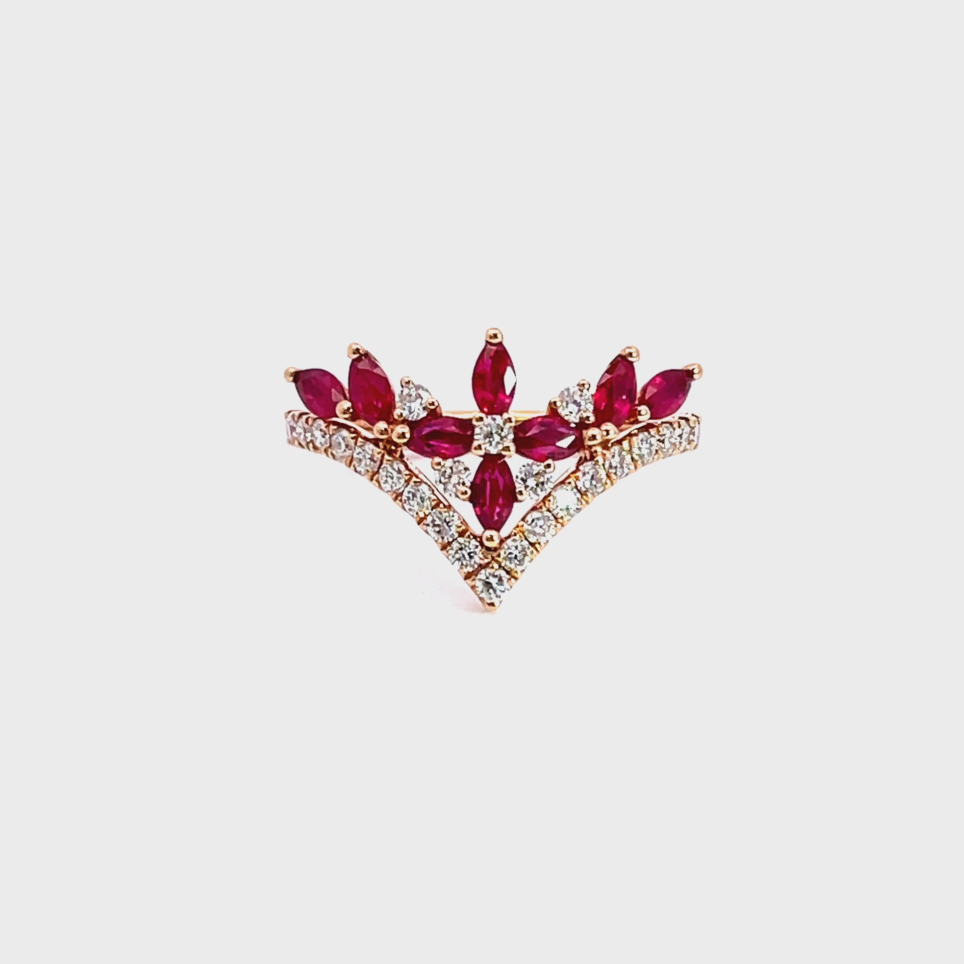 戒指採用了8顆醉人的酒紅色調馬眼形紅寶石作主石,紅寶石跟24顆鑽石的配合,恍似帶您進入了花花世界當中,閃爍誘人。有別於傅統V形的戒指,時尚新穎,展現您獨特的品味與個性。