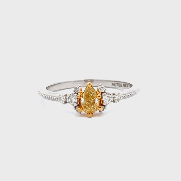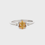 設計師採用了一顆梨形作為主石,主石兩旁以三爪鑲了8顆小白鑽,在小白鑽的點綴下令到戒指外觀設計恍似一雙「天使羽翼」襯托出主石的黃色清雅光芒。戒指臂兩邊亦加上了「珠邊」設計,加強了整體立體感。整體效果簡潔而夢幻讓你在任何時候和場合佩戴都光彩奪目,盡顯高貴的氣質。