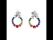 吊墜以彩虹色寶石鑲嵌而成,色彩繽紛,每邊耳環最上部份各有3朵小花,可愛而高貴每顆彩虹寶石配以簡單四爪鑲嵌方式。典雅而精緻的款式,適合任何場合佩戴。