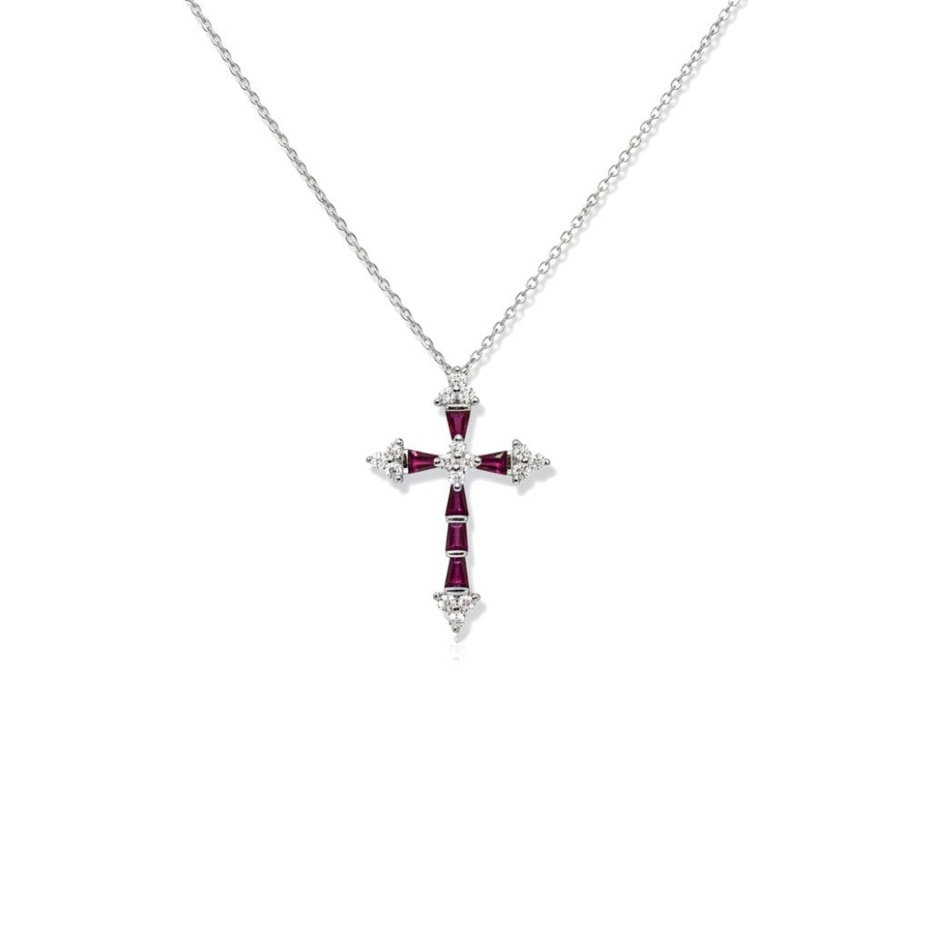經典十字架造型設計,白金鑲嵌工藝精緻優雅,紅寶石鑽石交錯閃耀低調奢華,百搭各種穿搭展現品味。深紅寶石色澤濃郁迷人,十字架線條流暢莊重,日常佩戴獨特有型彰顯信念。