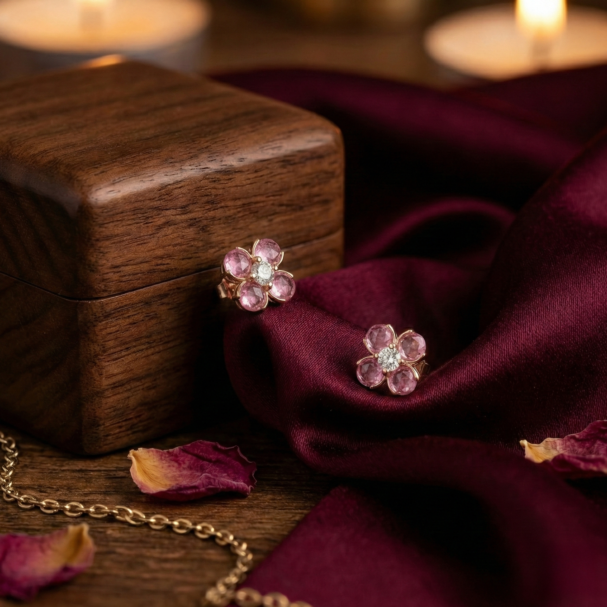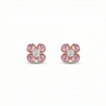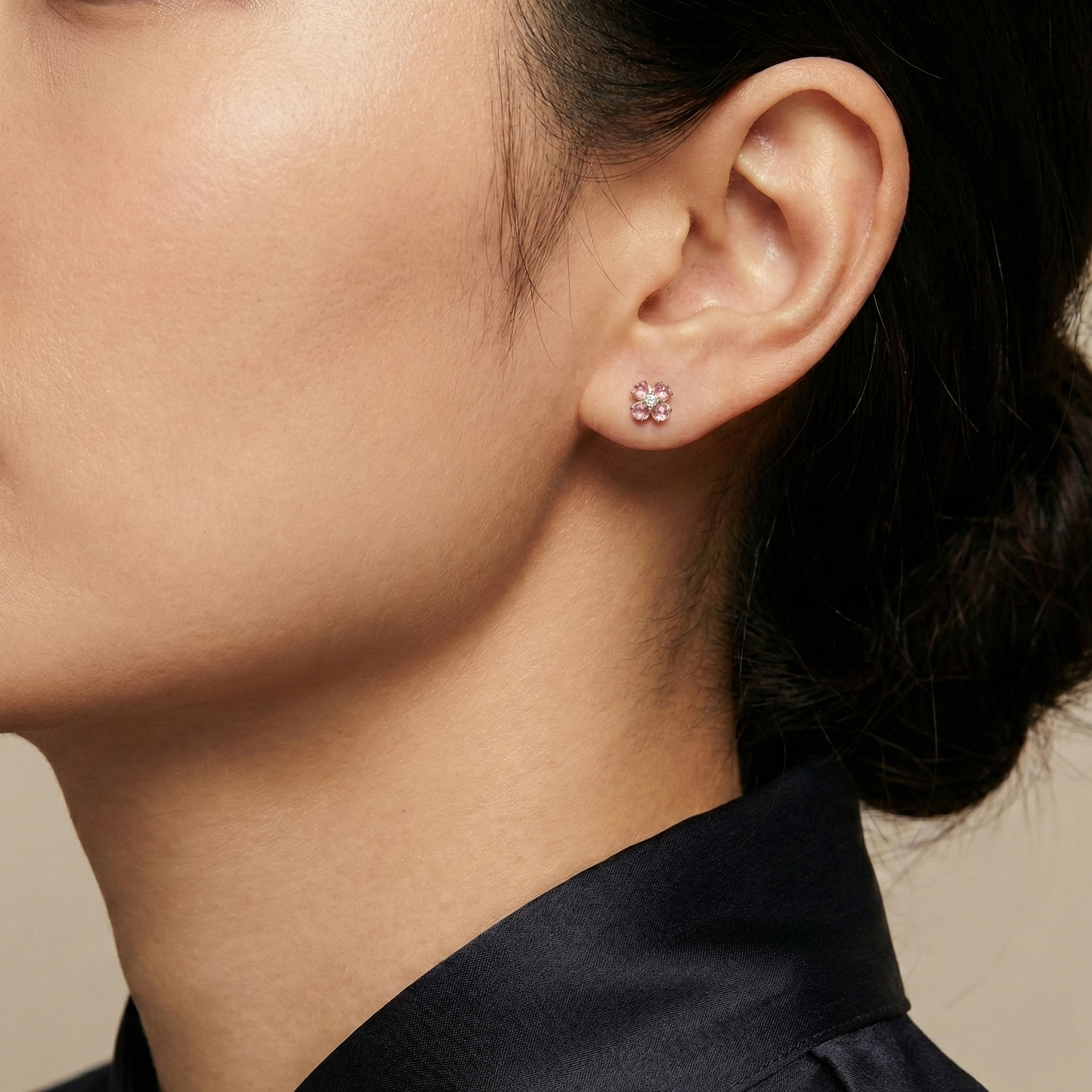以四葉花造型為靈感,粉紅寶花瓣搭配閃耀鑽石中心,象徵幸運與美好。細膩設計融合甜美與優雅,為您的日常或特別場合增添迷人魅力。