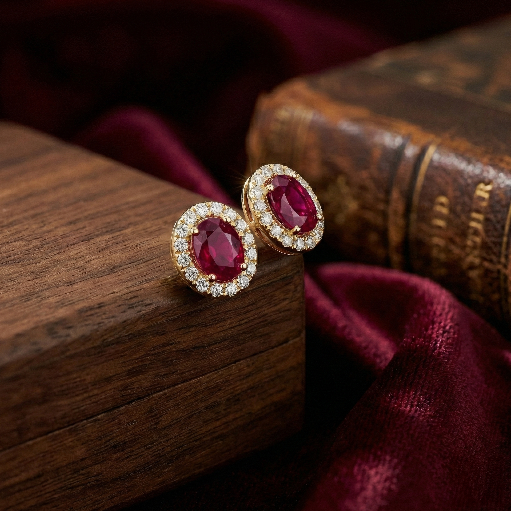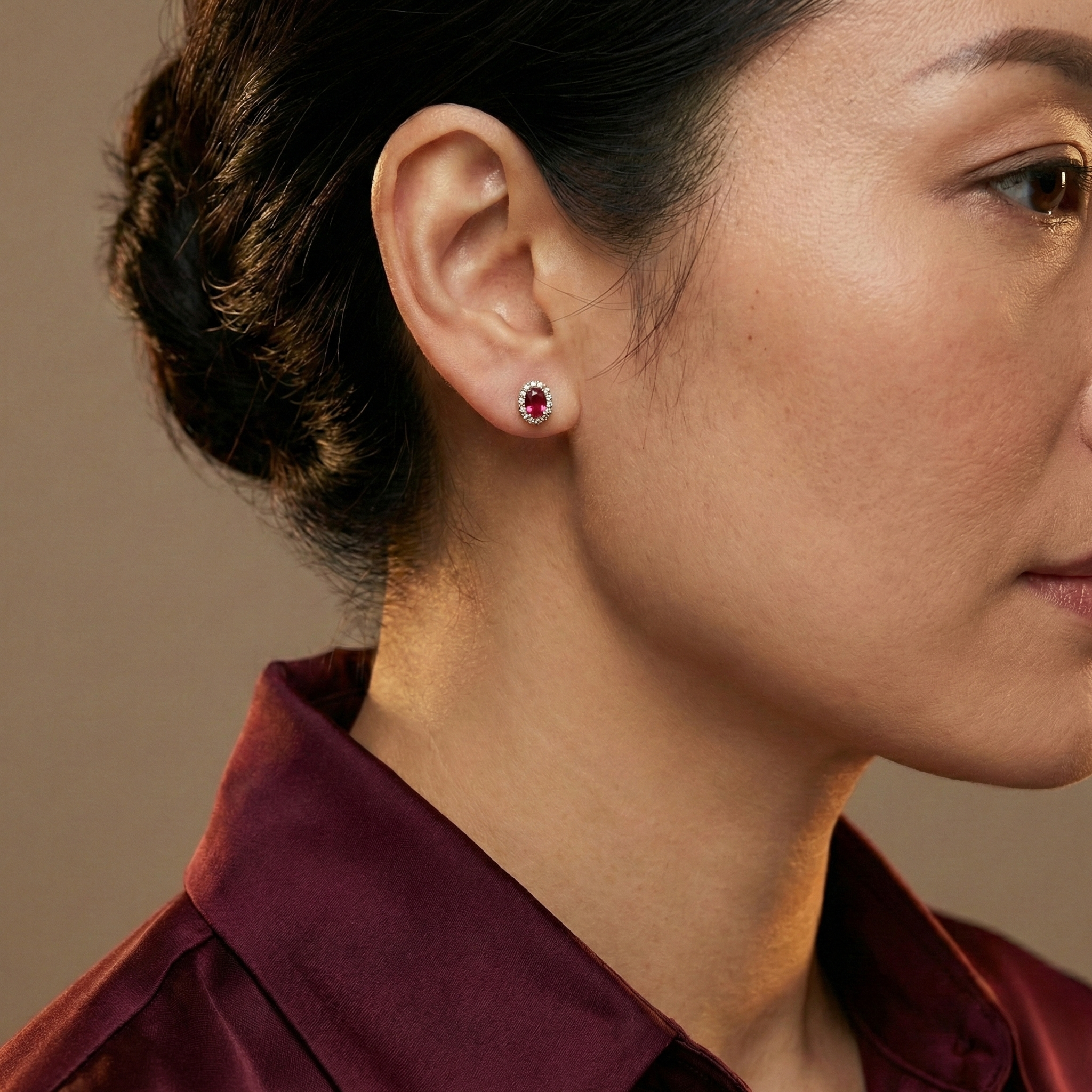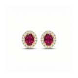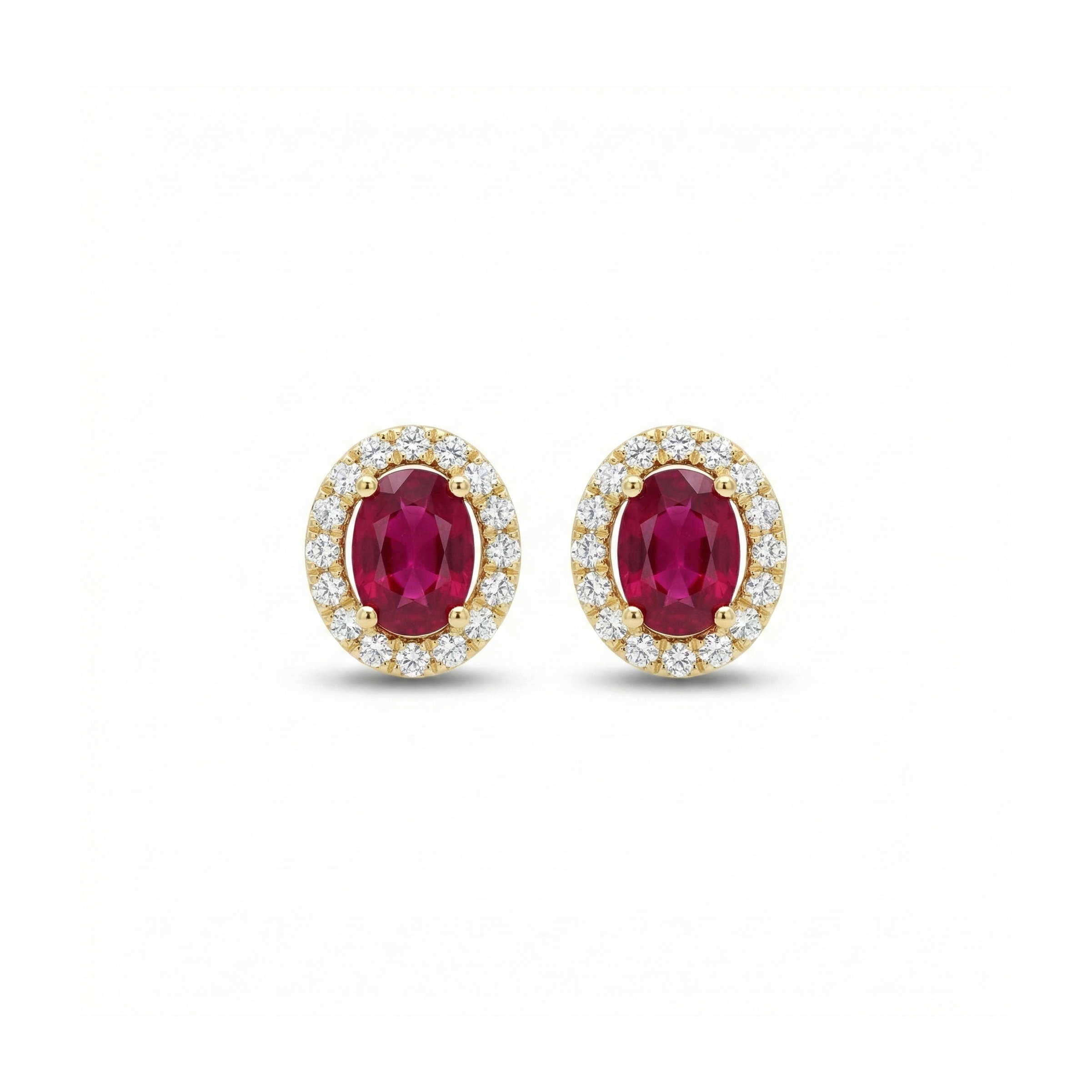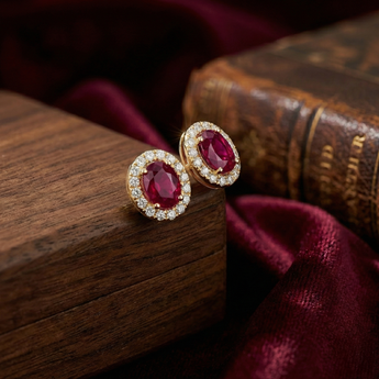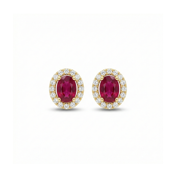 精緻的橢圓形紅寶石,散發濃郁的紅色魅力,周圍鑲嵌一圈閃耀鑽石,增添奢華氣息。搭配金色框架,完美襯托高貴與典雅,適合各種場合佩戴,展現迷人風采。
