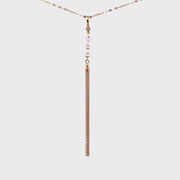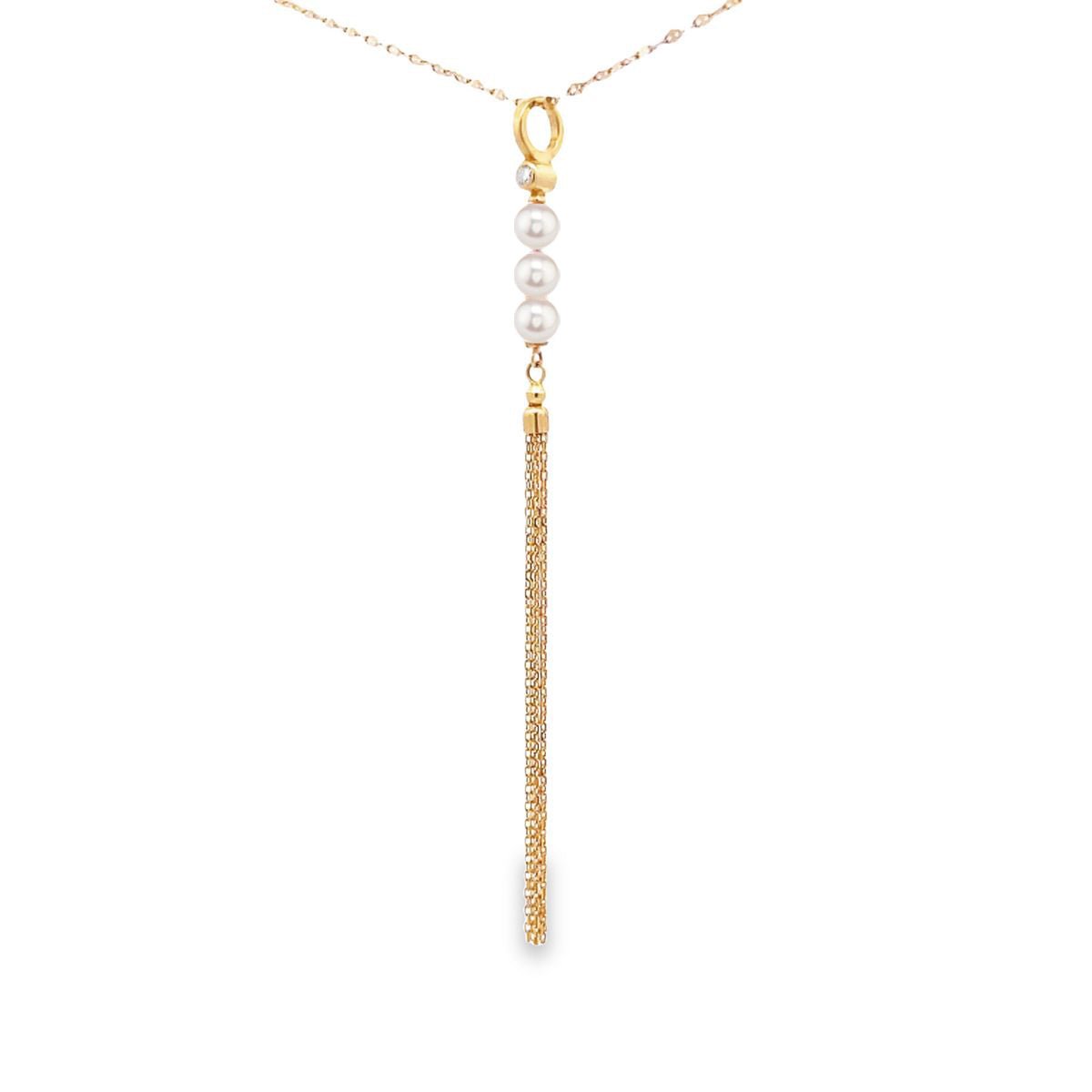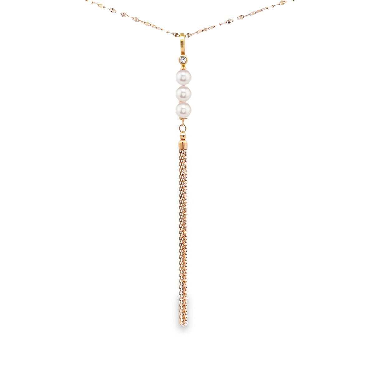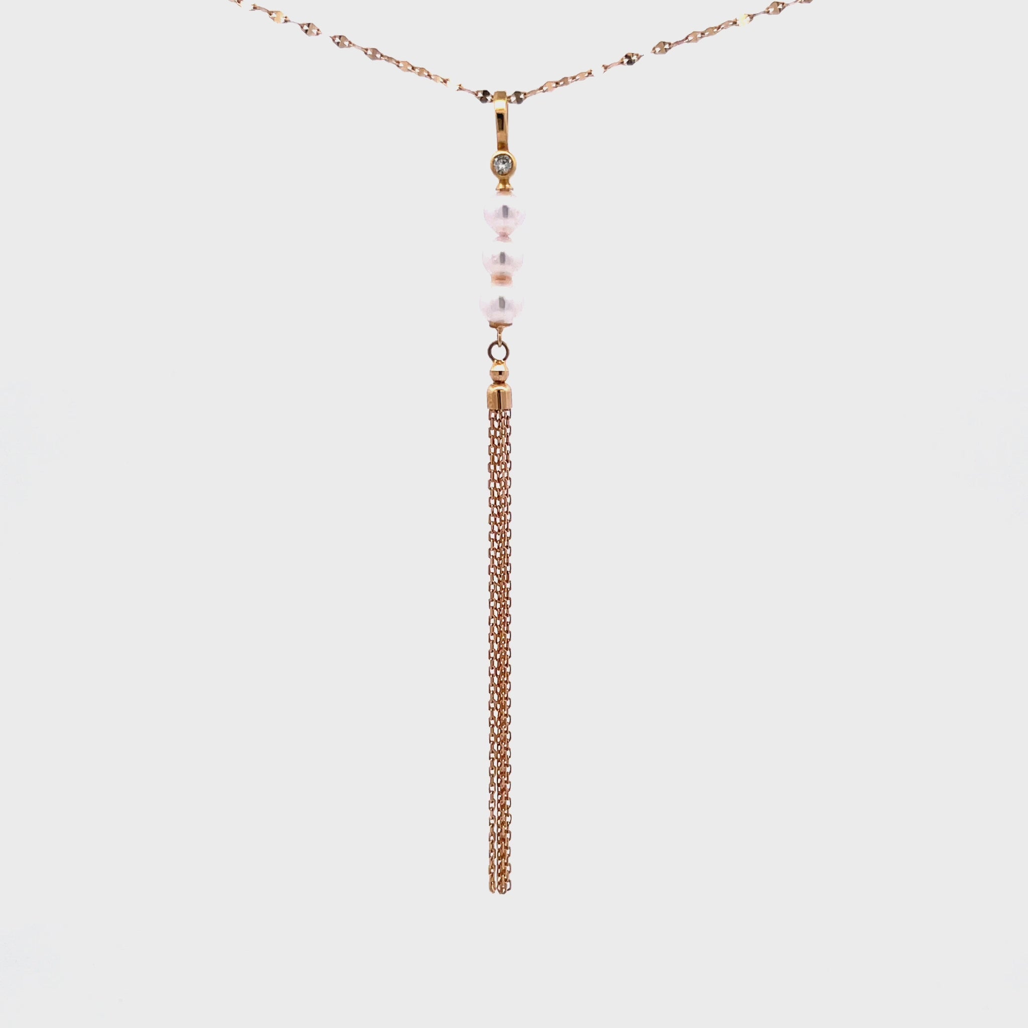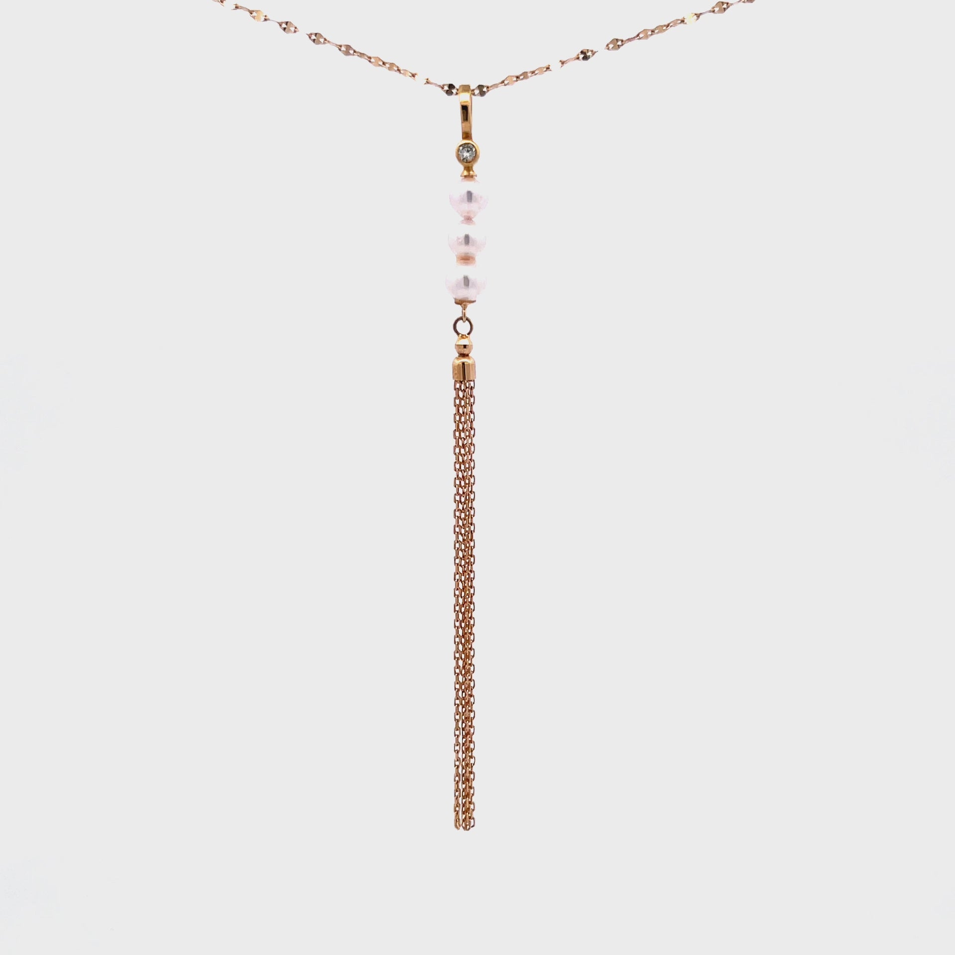 整條頸鏈焦點在於流蘇設計,整個流蘇設計採用了一顆閃鑽、三顆粉白小珍珠及18k黃金鏈構成的。當佩戴者佩戴起它時,金屬流蘇會隨着頸鏈靈活擺動。整體看起來好襯托出高貴而可愛的氣質。適合日常佩戴作簡單時尚的配襯,亦適合輕隆重場合。