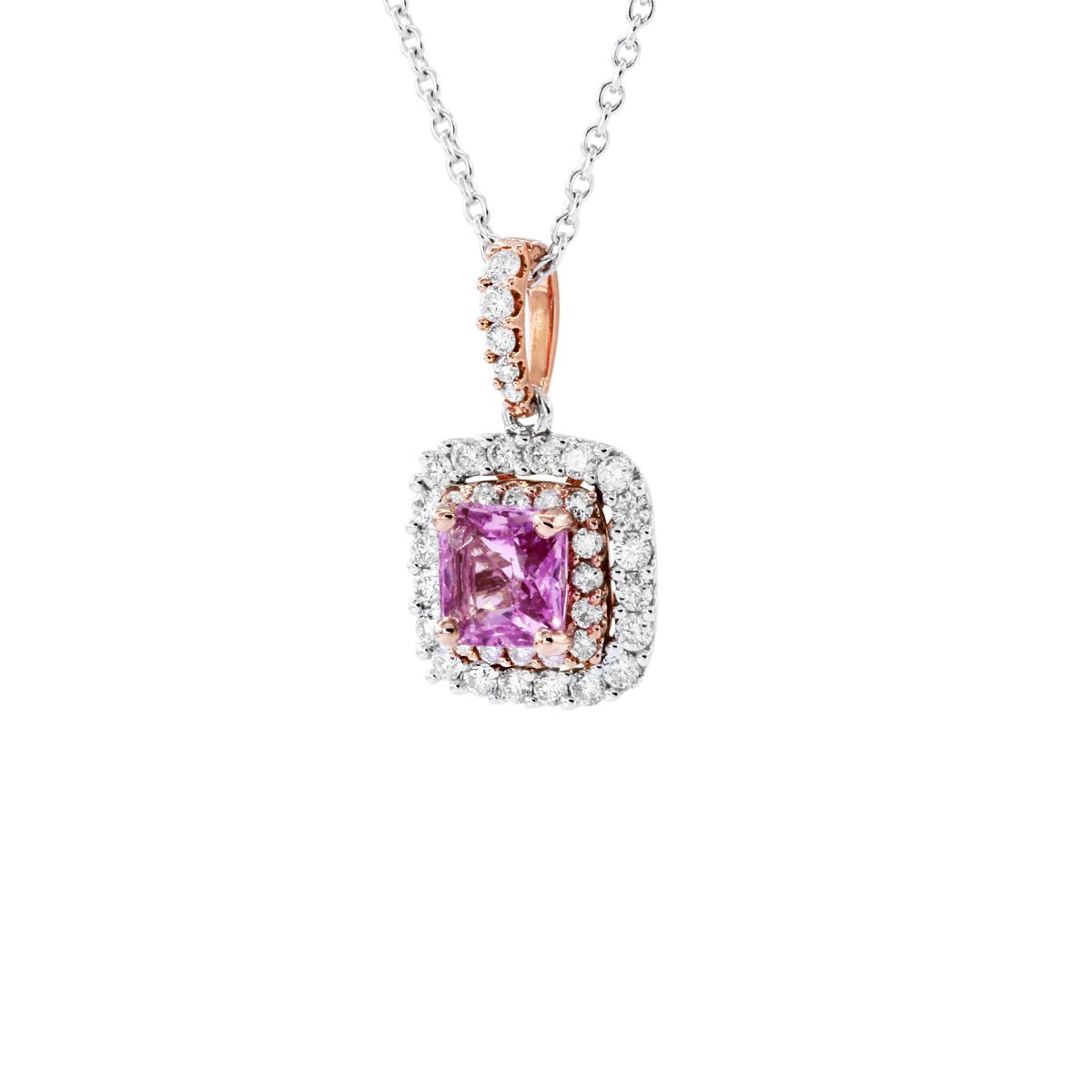 吊墜採用小八角形粉紫色藍寶石,清澈乾淨,火彩鮮艷亮麗;配上閃鑽映襯,展現璀璨光芒;新穎獨特的款式,讓您在日常上班或宴會上都不失婉約和高貴的氣質。