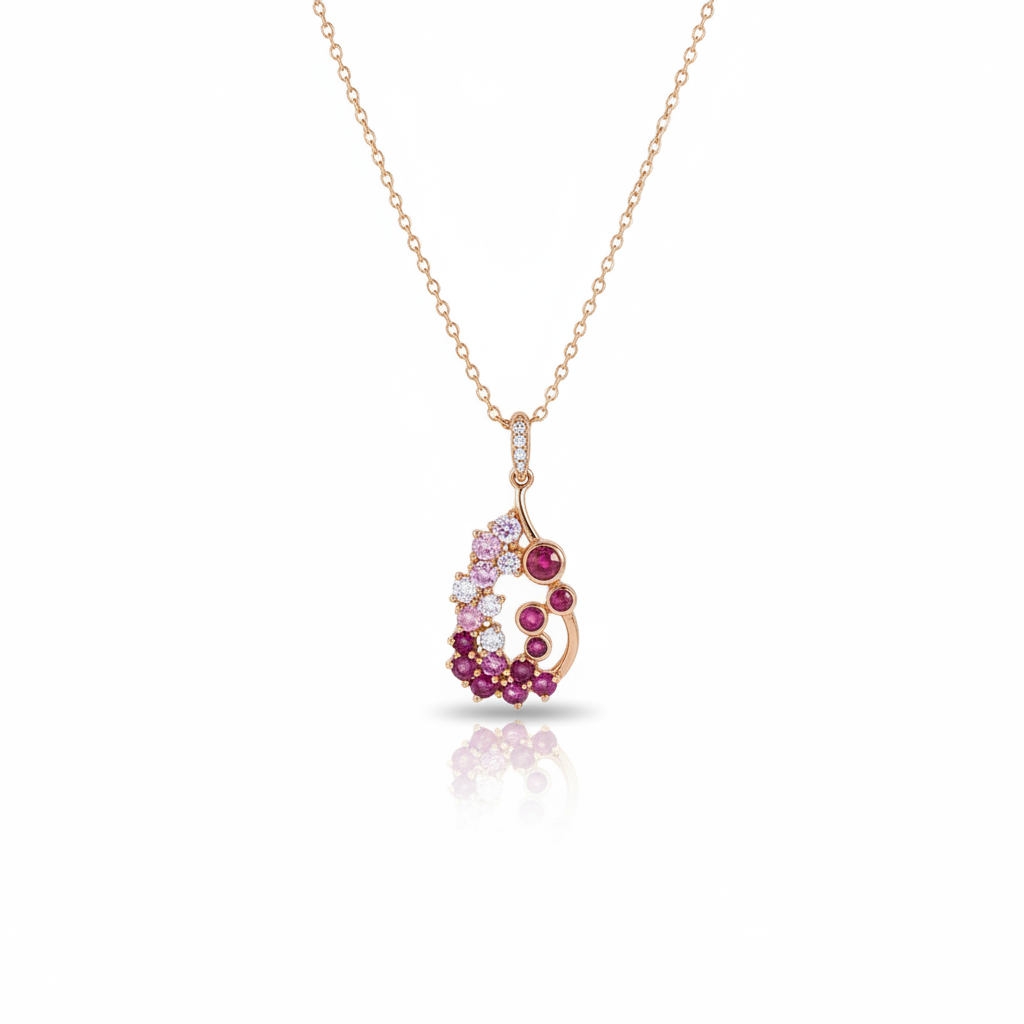 以漩渦造型為設計靈感,粉紅寶與紅寶石交織出迷人光彩,鑲嵌鑽石點綴,增添奢華感。玫瑰金鍊條襯托優雅氣質,是浪漫的完美象徵。