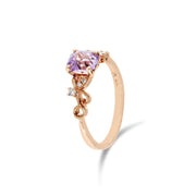 粉紅色藍寶石為戒指的主石,而戒臂部份利用了鑽石鋪鑲出整個花瓣,加上旁邊的扭紋狀的花莖,採用了獨有的珠邊技術,令到整個高貴感突出,同時淡粉色帶來溫暖的效果,穿搭方面可以穿一些溫色系的服裝,在工作或外出時佩戴都是不二之選。