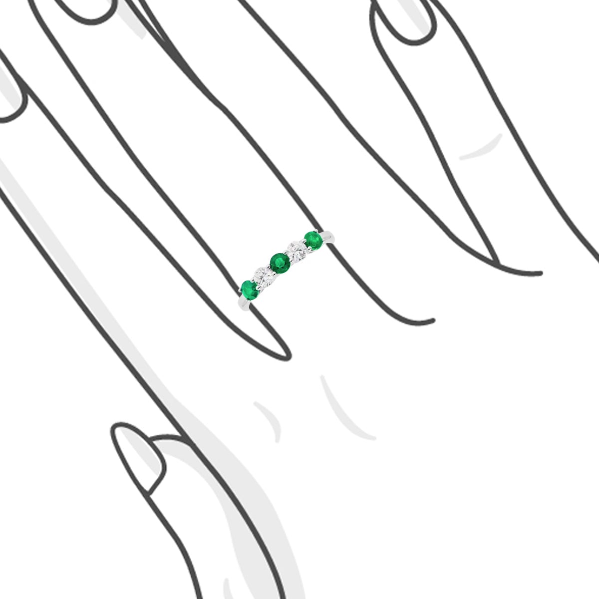 碧綠青翠的綠寶石,天然石質,呈現出綠寶石的原始美感。18K白金戒指上三顆翠綠色的綠寶石與兩顆別緻的圓形鑽石相間,明亮的綠寶石在閃爍的鑽石襯托下更加誘人,簡約的設計使整枚戒指時尚大方得來不失亮點,特別適合作為日常的首飾配搭。