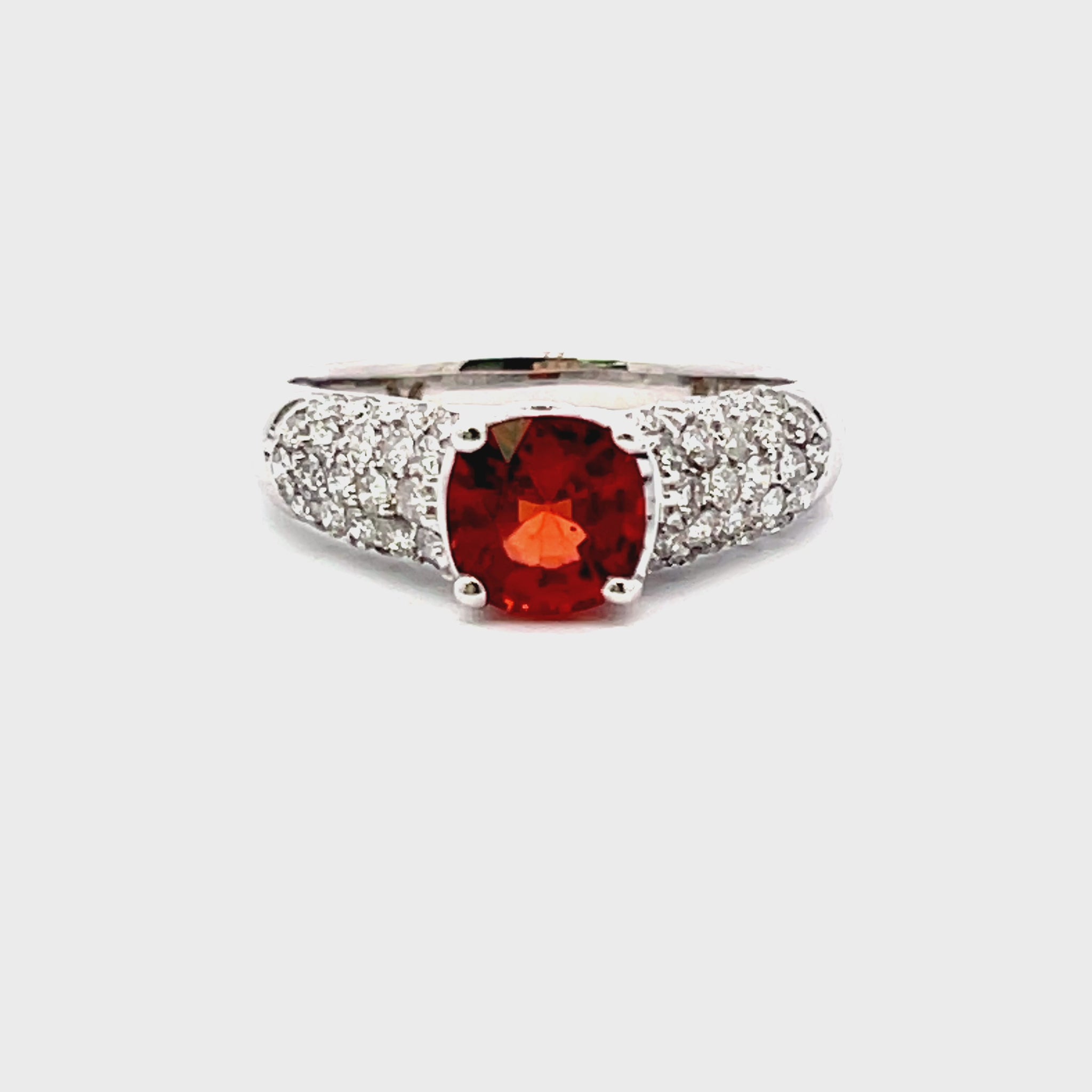 戒指採用了醉人的橙紅枕形尖晶紅色尖晶石作主石。而且戒臂兩端都鑲滿了50顆透亮耀眼的小白鑽,令到閃爍效果放大。而另一特別之處是戒指從側面看,主石的爪鑲設計成X形,還有兩顆包鑲閃鑽鑲在主石兩旁,設計隆重而特別,突顯你高貴迷人的氣質。
