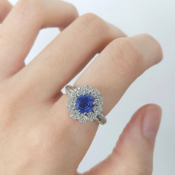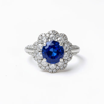 清澈的藍寶石外圍鑲了閃亮的圍石鑽石光環,更突顯藍寶石迷人的色澤,令配戴者戴起來光芒四射,令人眼前一亮,打造專屬於您的精緻珠寶款式。