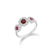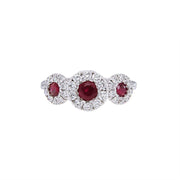 以紅寶石為主石的經典三石設計戒指;三顆精緻的圓形切割紅寶石,以無爪鑲嵌於雪亮的圓鑽中央,透出幽幽紅光,棲身於指背,在任何場合都能讓人不禁為您停駐凝望。