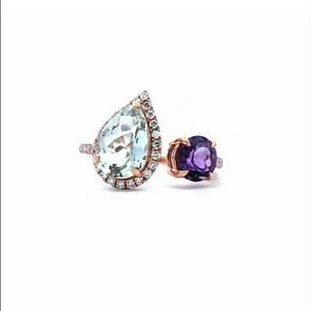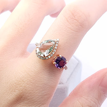 這款精美的紫晶戒指以其獨特的設計和閃耀的光芒吸引著每一個人的目光。綠色和紫色的水晶相互輝映,展現出無與倫比的優雅與奢華。