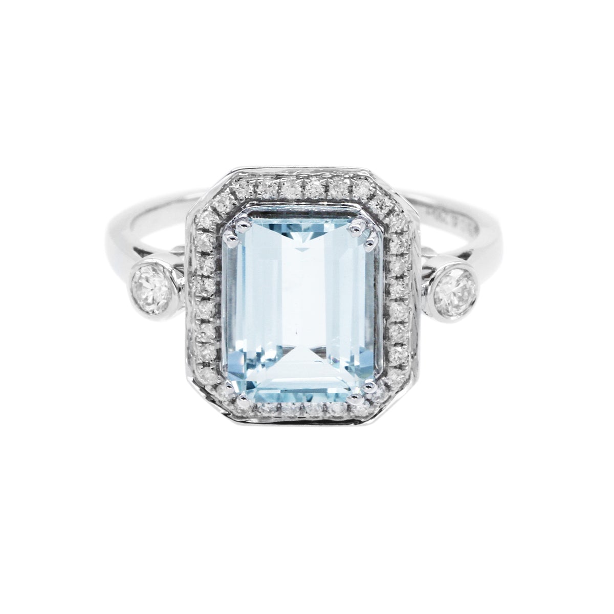 祖母綠形冰藍色海藍寶圍石鑽石戒指