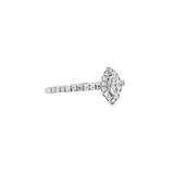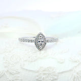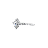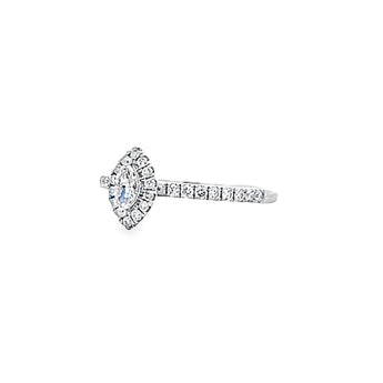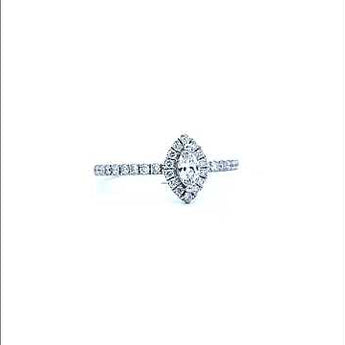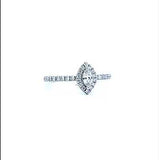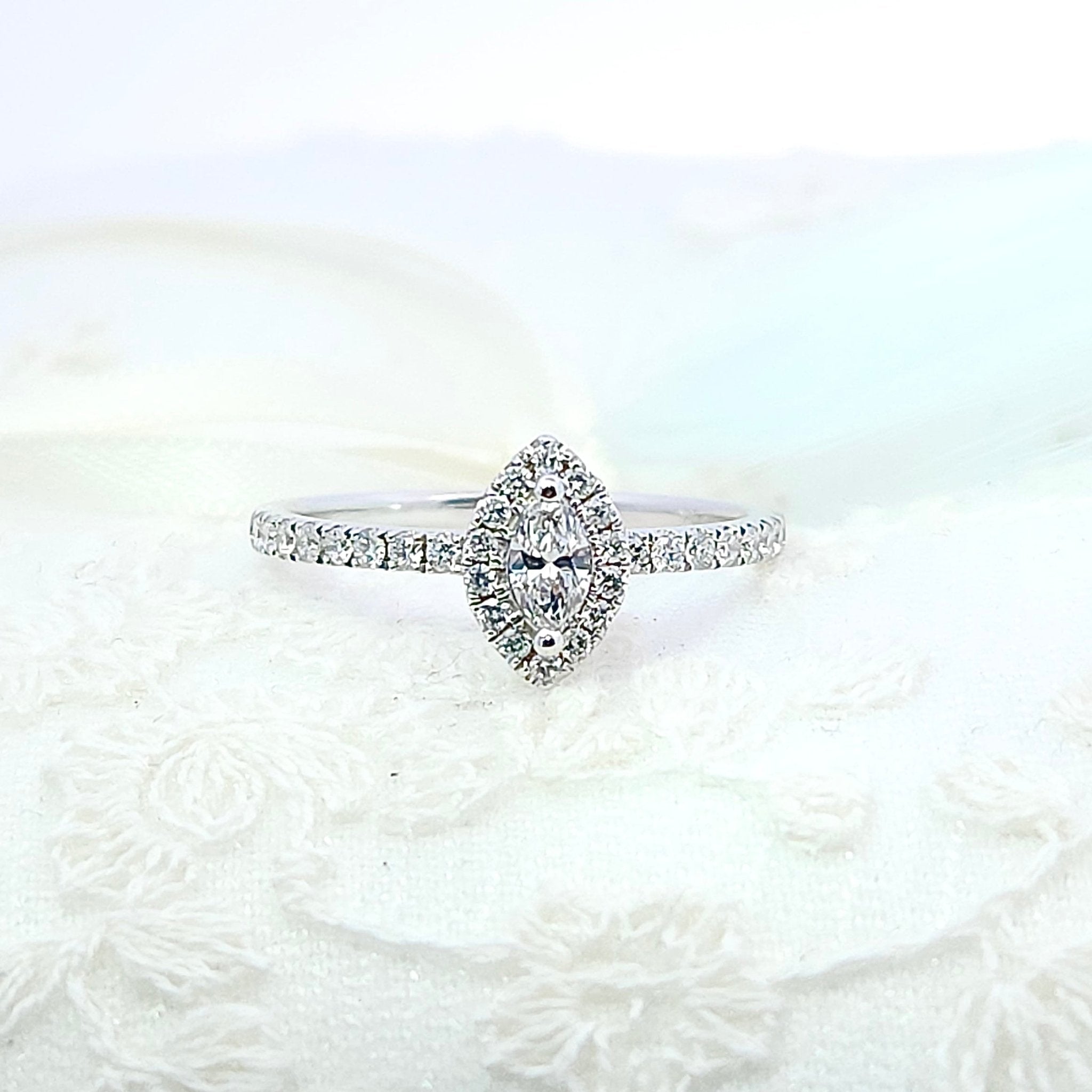 主鑽是一顆閃耀的馬眼形切割鑽石,周圍環繞著一圈精緻的小白鑽,更顯主鑽的璀璨奪目。戒指的戒圈也鑲嵌著一排細小的鑽石,增添了整體的美感與奢華感。